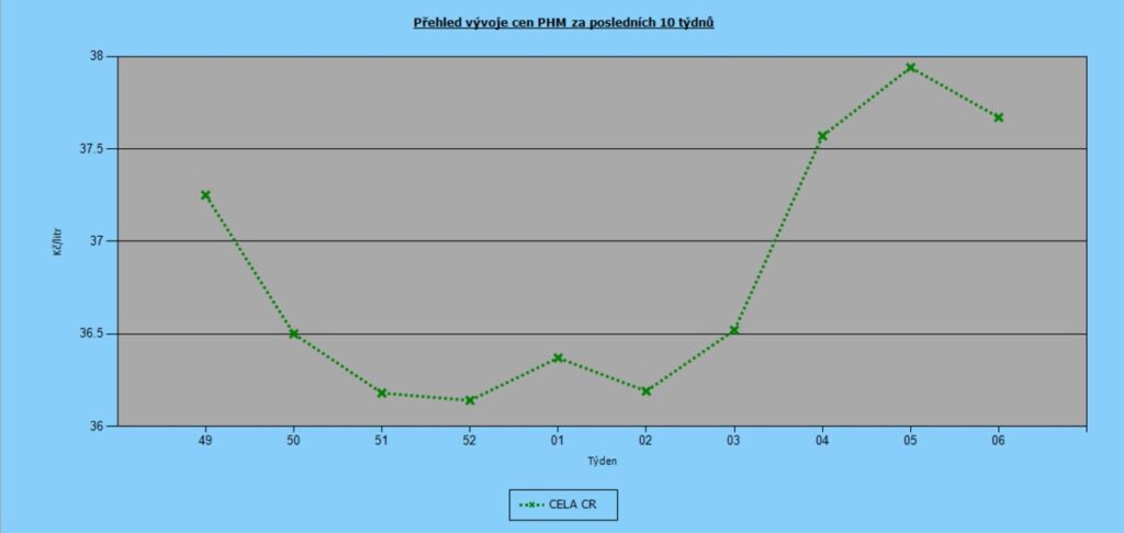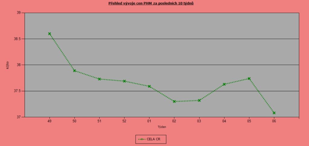 Od druhého lednového týdne začala cena pohonných hmot opět nepatrně růst. Minulý týden však hladina klesla. Konkrétně u Naturalu 95 o 27 haléřů a u nafty o 66 haléřů. V průměru tedy tankujeme benzín za 37,67 Kč/l a naftu za 37,08 Kč/l.