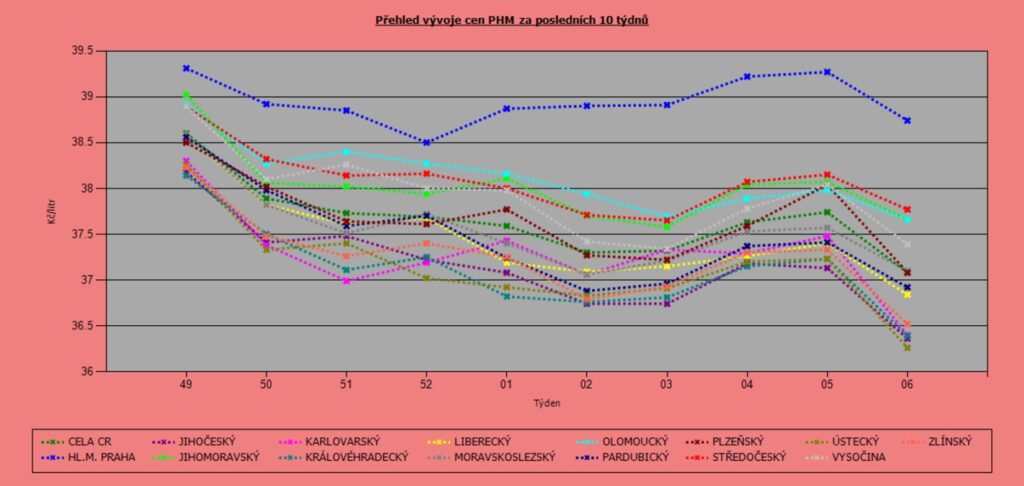 Natural 95 natankují řidiči nejlevněji v Jihočeském (37,14 Kč/l) a Karlovarském kraji (37,20 Kč/l). Naopak nejvíce zaplatí v Praze (38,89 Kč/l) a na Vysočině (38,00 Kč/l).