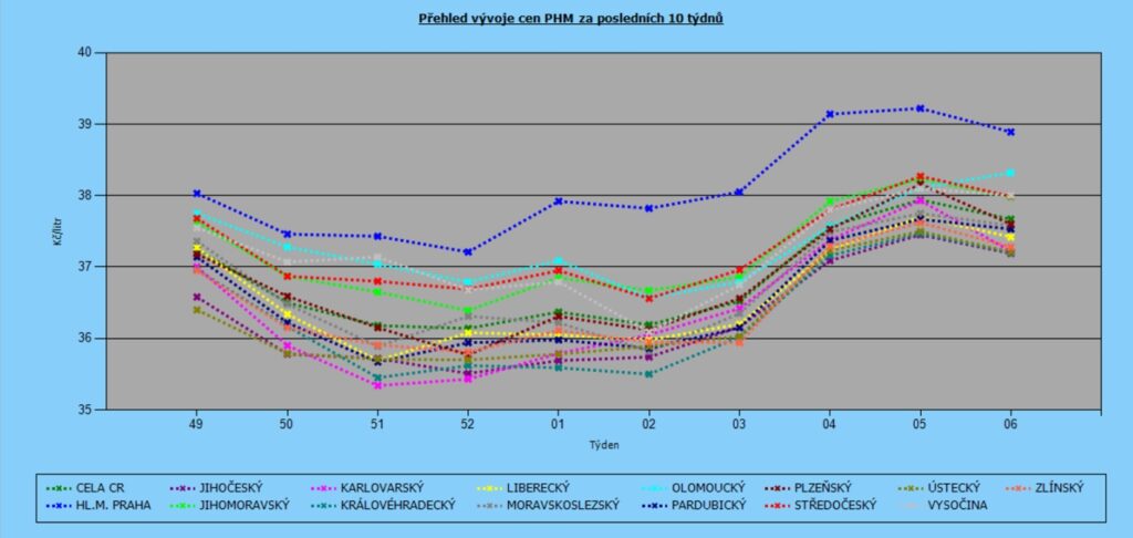 Nejlevněji vychází nafta v Ústeckém (36,26 Kč/l) a Jihočeském kraji (36,36 Kč/l). Nejvyšší ceny zůstávají opět v Praze (38,74 Kč/l) a ve Středočeském kraji (37,77 Kč/l).