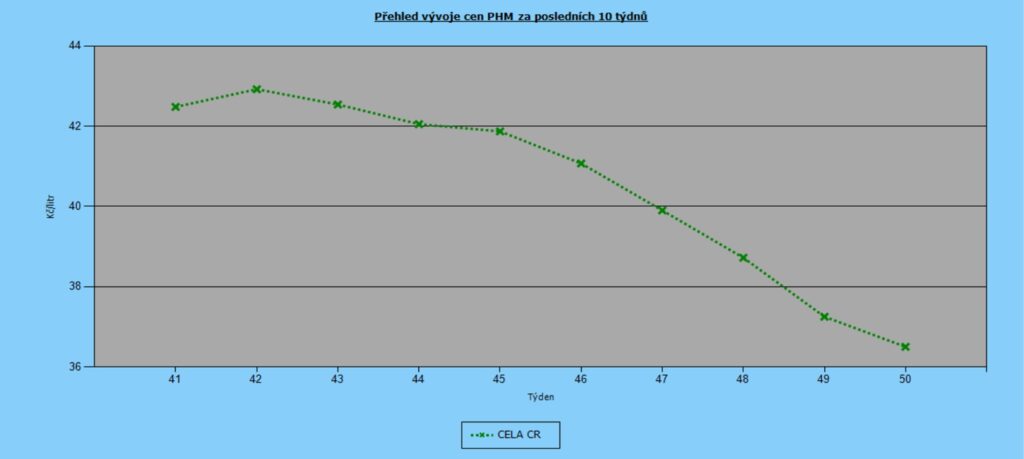 Od začátku října ceny pohonných hmot soustavně klesají. Za poslední týden tankujeme Natural 95 levněji o 75 haléřů za 36,50 Kč/l. Nafta zlevnila o 71 haléřů na 37,89 Kč/l.