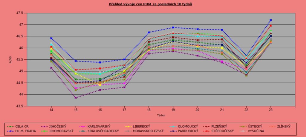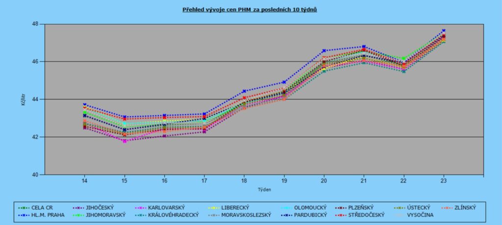Nejlevněji vychází nafta v Jihočeském a Královéhradeckém kraji (46,23 Kč/l) a na Karlovarsku (46,24 Kč/l). Nejvyšší ceny zůstávají opět v Praze (47,20 Kč/l) a Středočeském kraji (46,96 Kč/l).