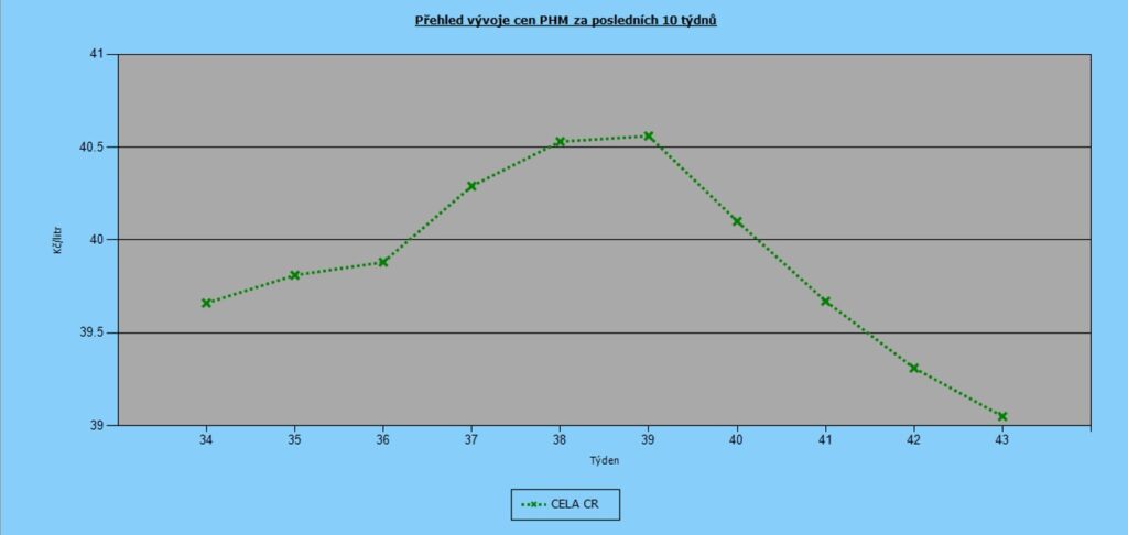 Od konce září platíme na čerpacích stanicích za pohonné hmoty čím dál méně. Za poslední týden zlevnil Natural 95 o 26 haléřů na průměr 39,05 Kč/l. Stejně tak spadla průměrná cena nafty o 17 haléřů na 39,50 Kč/l.
