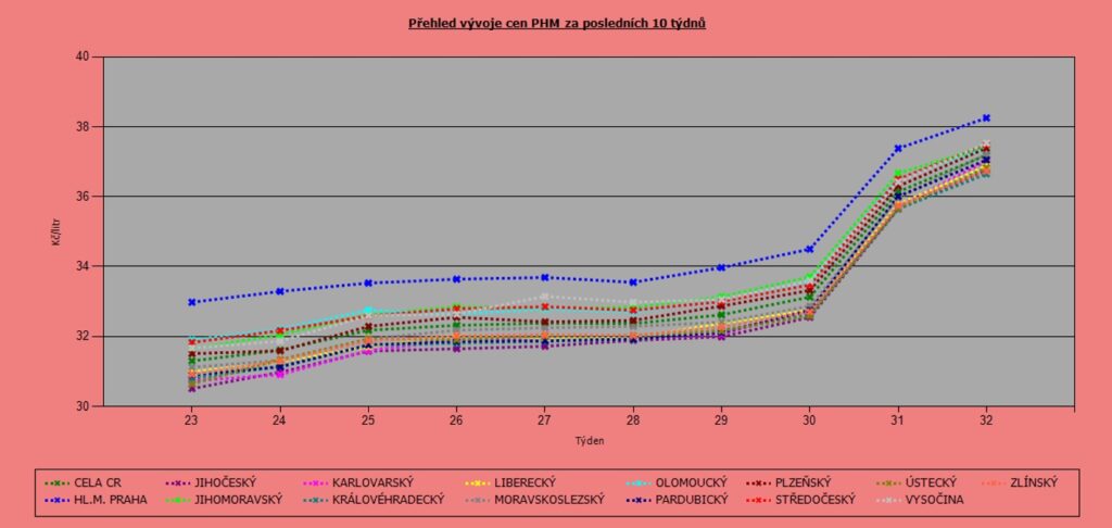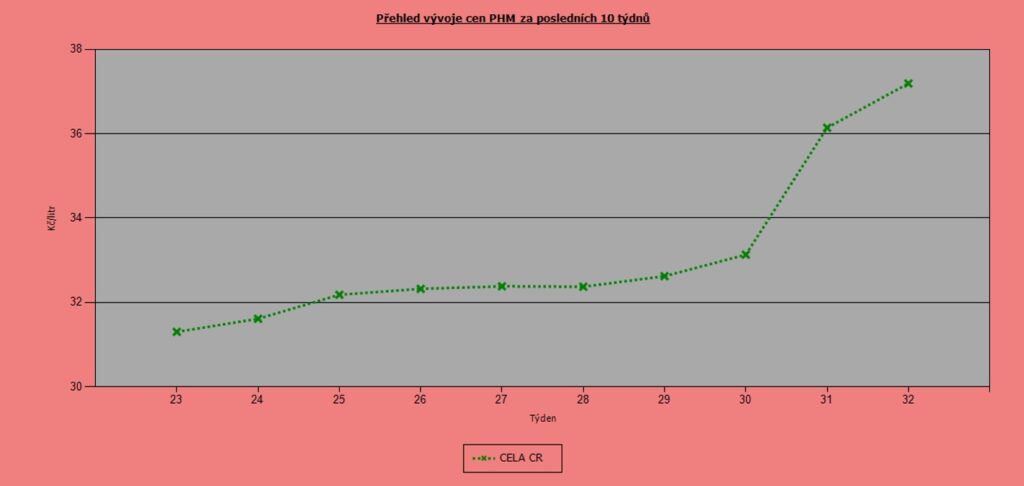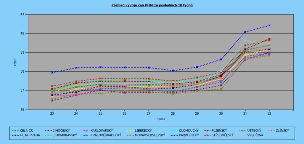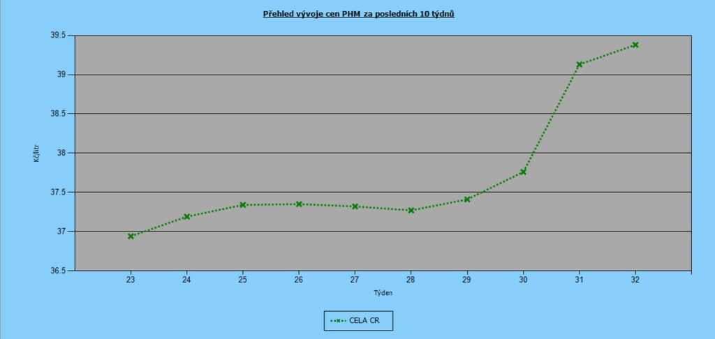 Po skokovém zdražení pohonných hmot ceny rostly také v posledním týdnu. Natural 95 zdražil o 25 haléřů na průměrných 39,38 Kč/l. Nafta poskočila o 1,05 koruny a průměrných 37,19 Kč/l. Ve srovnání se začátkem července nás litr nafty stojí o 4,81 korun více.