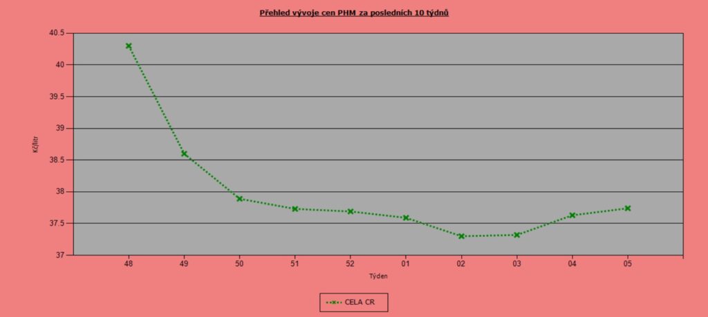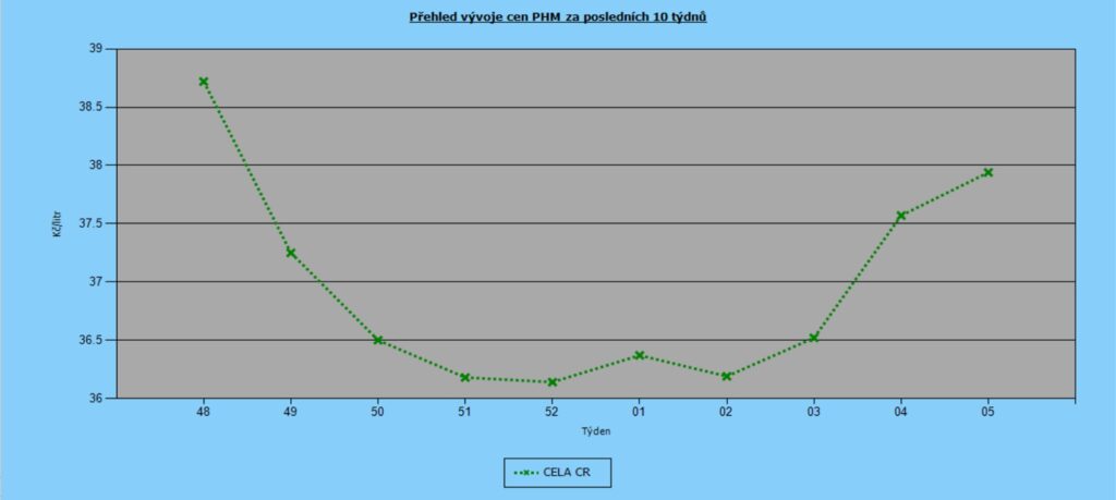Třetí lednový týden dosáhly ceny pohonných hmot svého minima a od té doby nastoupil rostoucí trend. Ten však není nijak dramatický. Za poslední týden stoupla cena Naturalu 95 o 36 haléřů na 37,94 Kč/l. Nafta zdražila o 11 haléřů na 37,74 Kč/l.
