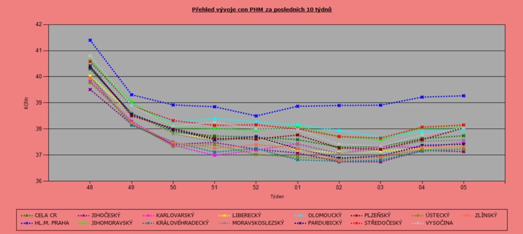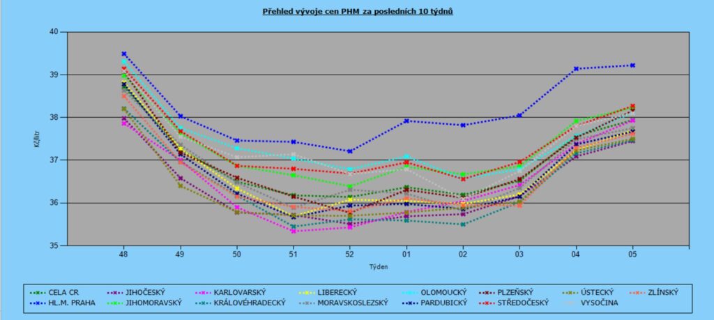 Nejdražšími kraji zůstávají tradičně Praha (39,22 Kč/l) a Středočeský kraj (38,27 Kč/l). Naopak nejnižší ceny jsou v Jihočeském (37,45 Kč/l) a Královéhradeckém kraji (37,47 Kč/l)