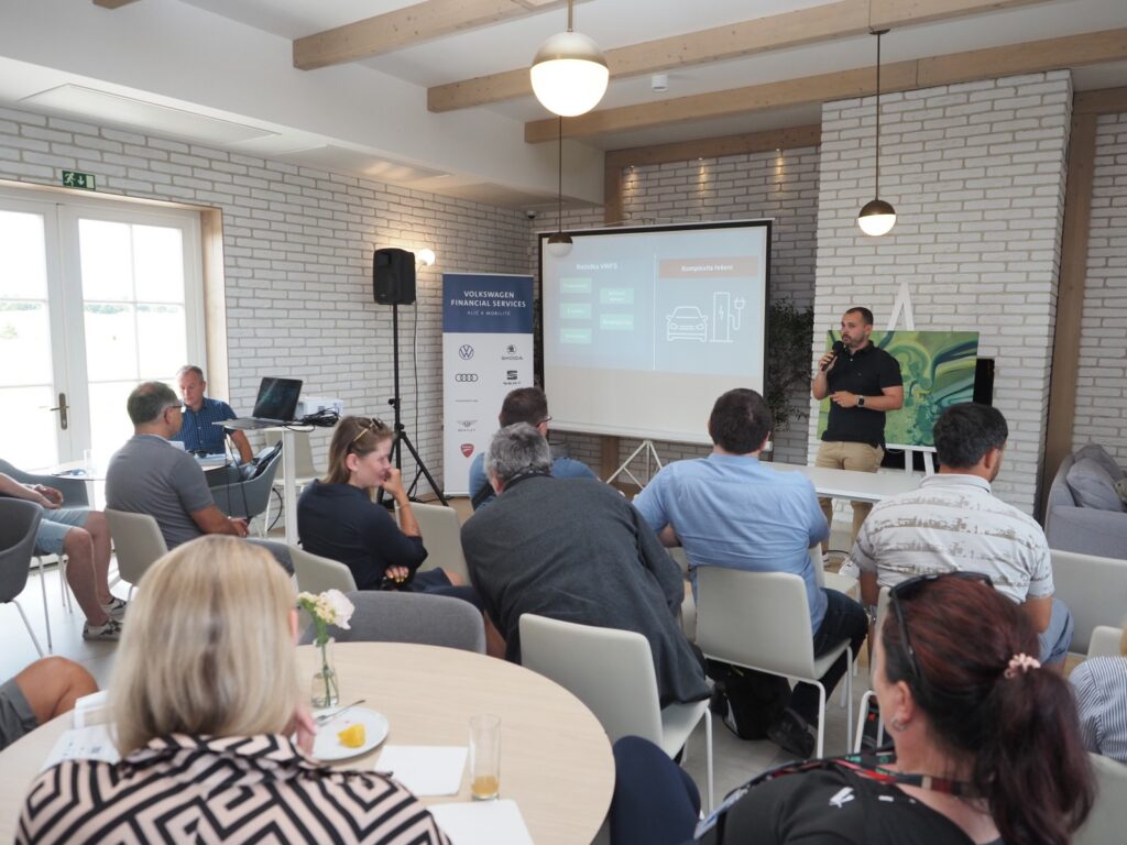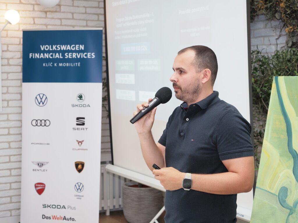 Václav Vacek ze společnosti Volkswagen Financial Services zahájil vzdělávací blok příspěvkem o službách spojených s elektromobilitou, zejména pak autopůjčovnou, která je ideálním prostředkem pro vyzkoušení elektromobility a jejím reálném přínosu firmě během krátké zápůjčky. Neopomenul ani státní dotační program na pořízení bateriového vozu a nabíjecí stanice.