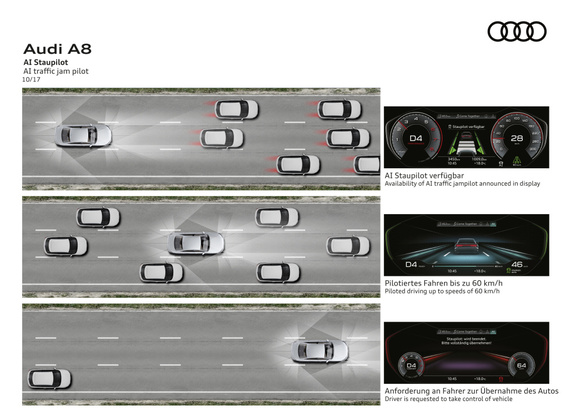 Nové Audi A8 je prvním automobilem na světě vyvinutým pro vysoce automatizovanou jízdu úrovně 3. Audi AI traffic jam pilot přebírá řízení vozidla na víceproudých silnicích s popojíždějící dopravou rychlostí až 60 km/h, pokud to legislativa na příslušném trhu povoluje a řidič tuto funkci aktivuje. Předpokladem automatizované jízdy je maximálně přesný obraz okolí v každém okamžiku. Klíčovou technologií pro dosažení tohoto stavu je umělá inteligence.