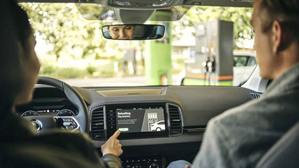 Díky nové službě Pay to Fuel je nyní placení u čerpacích stanic pro řidiče Škoda pohodlnější a rychlejší: Ušetří čas tím, že platbu provedou přímo z informačního a zábavního systému vozu.