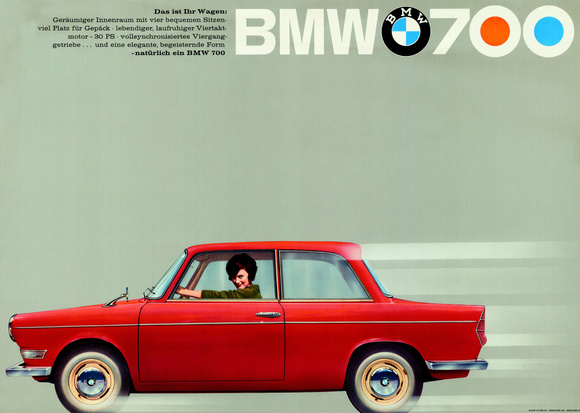 1959 60 let BMW 700, kompaktní sportovně laděný vůz s motorem vzadu pohánějícím zadní kola. První nově vyvinuté poválečné BMW.