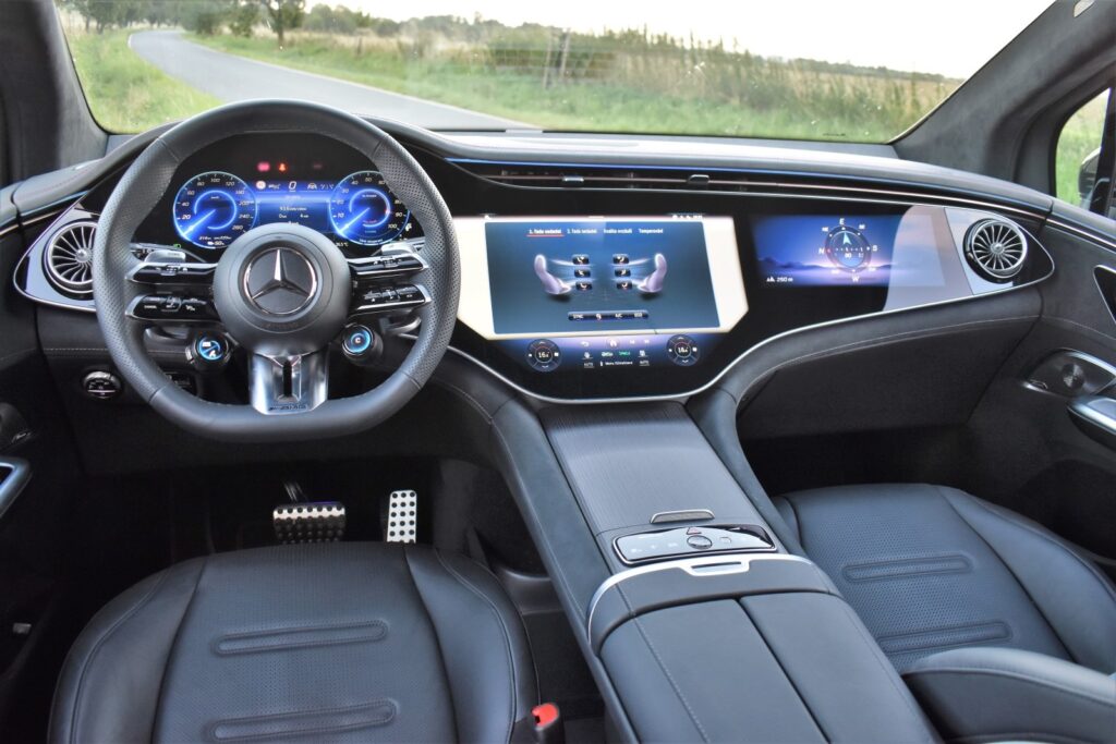 Po limuzínách EQS a EQE se tak na specifické elektrické platformě objevila stejně pojmenovaná SUV. Podobně jako tomu je u dalších Mercedesů EQ, má i EQE SUV velkou konkurenční výhodu v provedení interiéru. Palubní desku může tvořit „hyperobrazovka“ MBUX Hyperscreen. Stojí 216 000 korun a sdružuje obrazovku místo přístrojové desky, multimediální systém a OLED obrazovku před spolujezdcem. Všechny tři displeje jsou propojené navzájem, což dává pocit, že palubní deska je zkrátka jen jedna velká obrazovka.