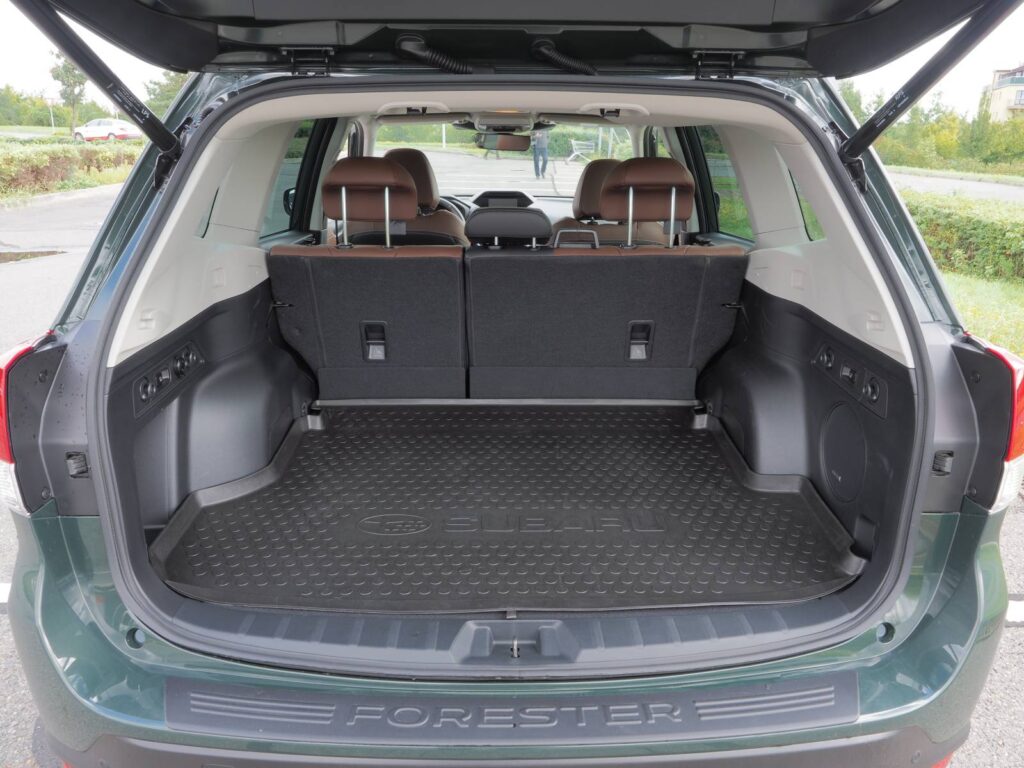 Hodnotně působící interiér zaujme členitým uspořádáním a několika barevnými displeji. Kromě analogových kontrolních přístrojů před volantem, které doplňuje barevný displej palubního počítače, má řidič k dispozici dotykový středový displej infotainmentu a malý informační displej v kapličce nad ním. Před kontrolními přístroji je navíc malý otvor, podle kterého by se dalo usuzovat, že má forester ve výbavě i head-up displej, odtud se však na přední sklo promítají jen světlená a zvuková upozornění na blížící se překážku.